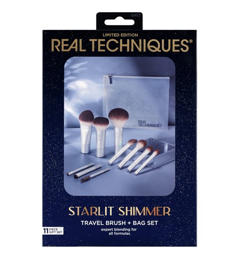 The Real Techniques Starlit Shimmer Travel Brush + Bag Set is designed with 10 mini makeup brushes and a cosmetic bag for the traveler to grab and glow.